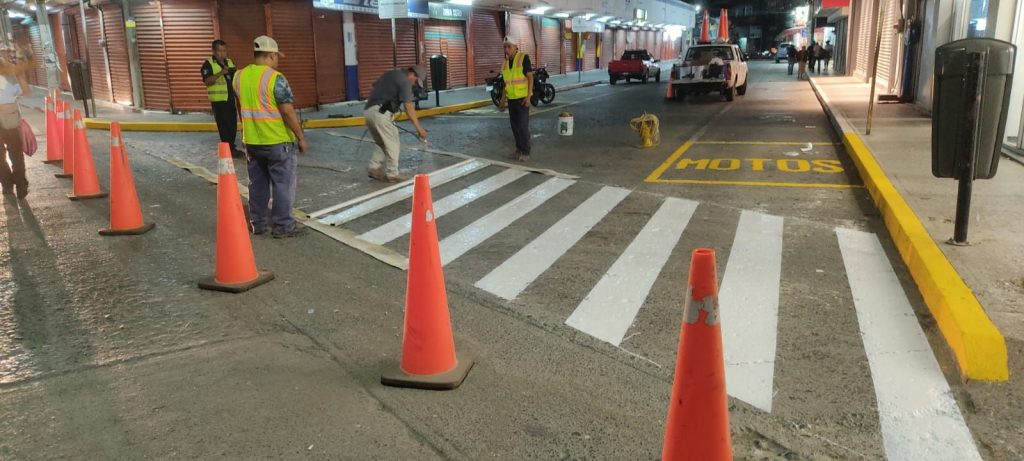Personal de Tránsito continúa con el balizamiento de las calles que registran mayor movilidad, para incrementar la seguridad de automovilistas y peatones.