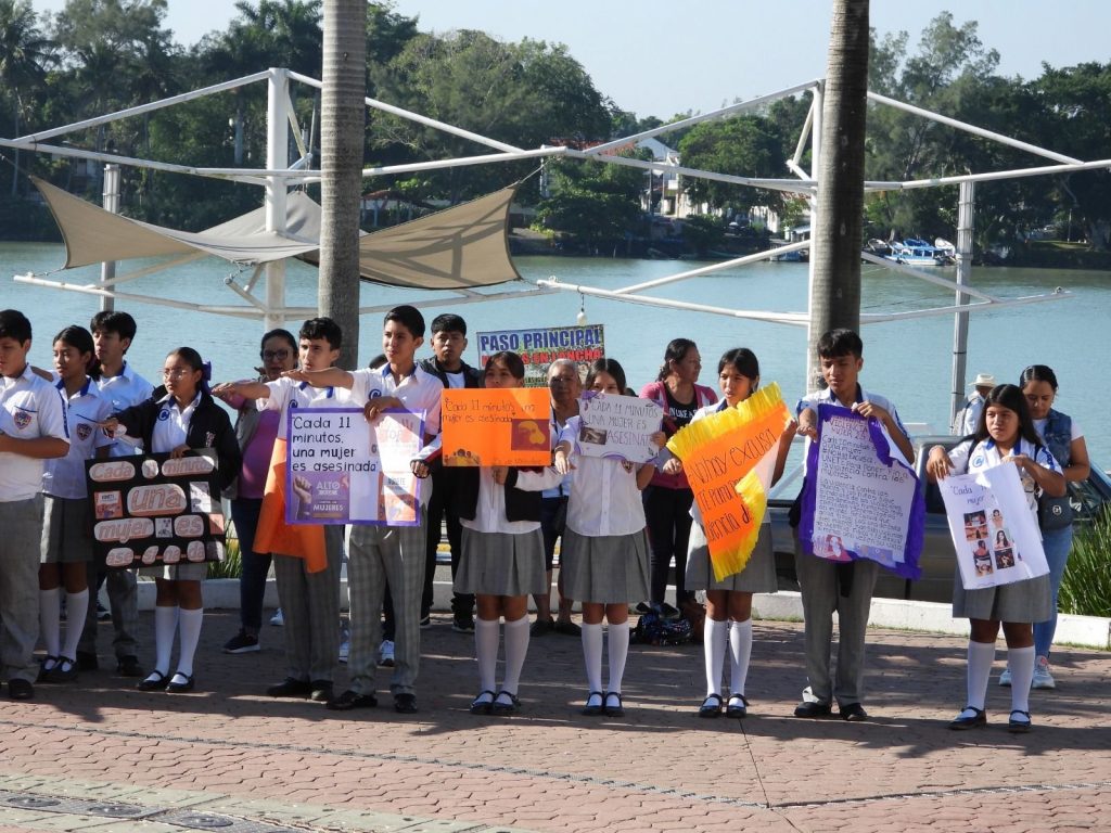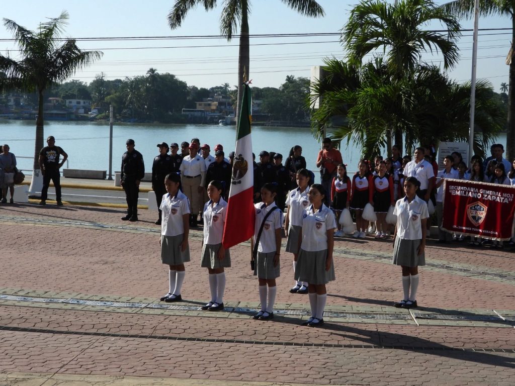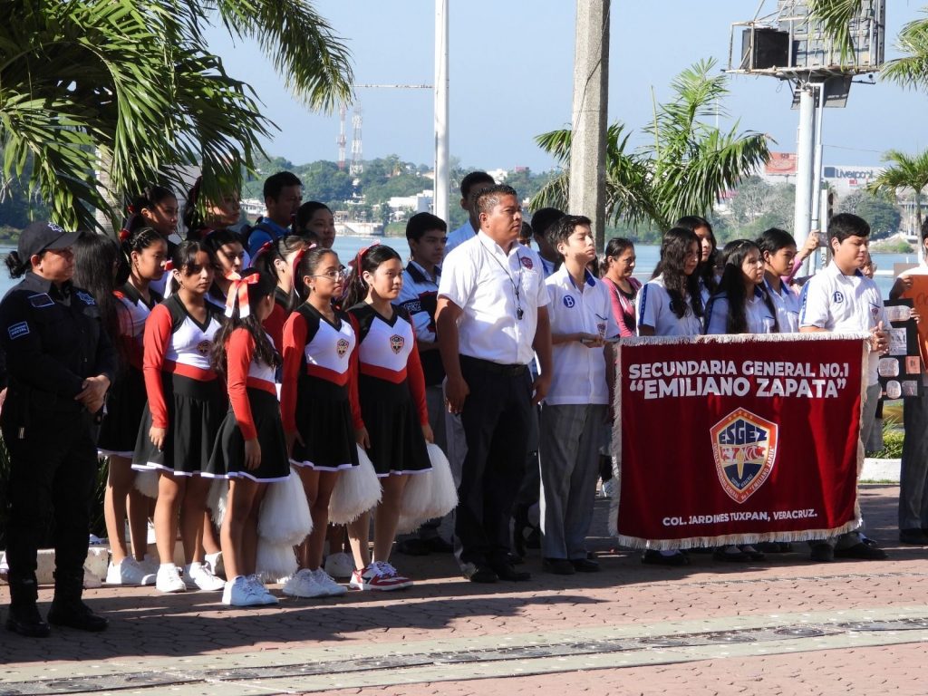 La Secundaria General Núm. 1 Emiliano Zapata participó esta mañana en el Lunes Cívico que realizó el gobierno de Tuxpan en la explanada municipal, en el marco del Día Internacional de la Eliminación de la Violencia contra la Mujer.