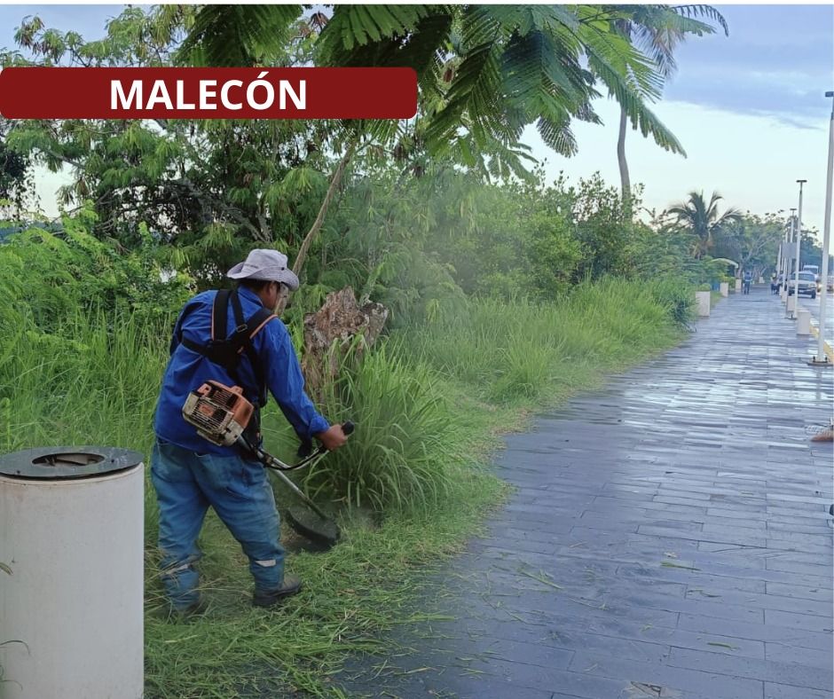 Cuadrillas de Parques y Jardines están atendiendo áreas verdes del Libramiento López Mateos, bulevar Maples Arce (carretera a la playa) y la ribera del río, a lo largo de tramos del nuevo malecón.