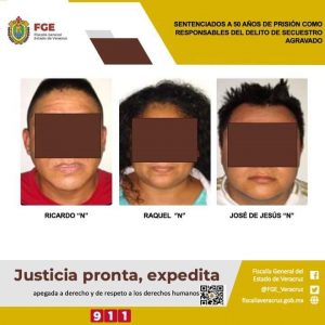 La Fiscalía General del Estado informa que, a través de la Unidad Especializada en Combate al Secuestro, logró sentencia condenatoria de 50 años de prisión en contra de Ricardo “N”, Raquel “N” y José de Jesús “N”, integrantes de una banda de secuestradores de Coatzacoalcos, como responsables del delito de secuestro agravado, cometido en agravio de la víctima identificada con las iniciales L.E.O.T.