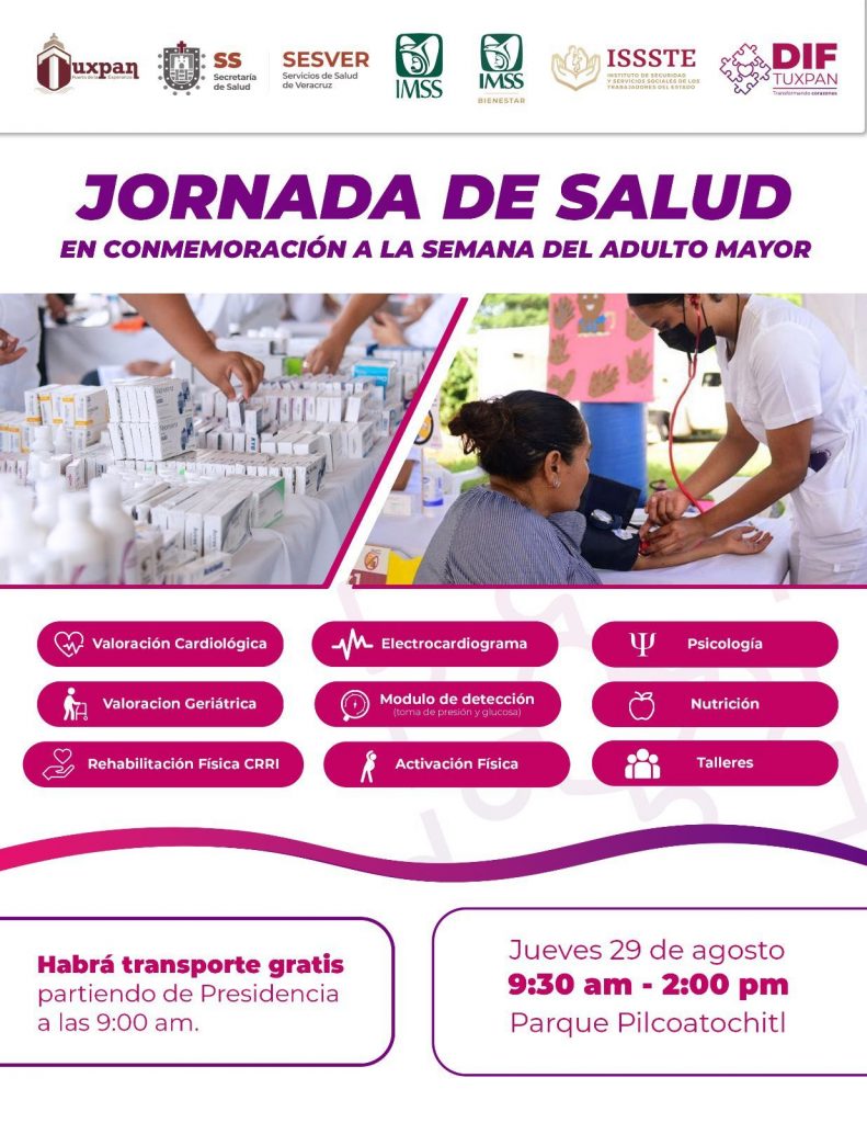 El Sistema para el Desarrollo Integral de la Familia (DIF) Tuxpan, que preside Pamela Morales Huesca e instituciones médicas, desplegarán recursos humanos y materiales para realizar este jueves 29 de agosto la “Jornada de Salud gratuita para el Adulto Mayor”.