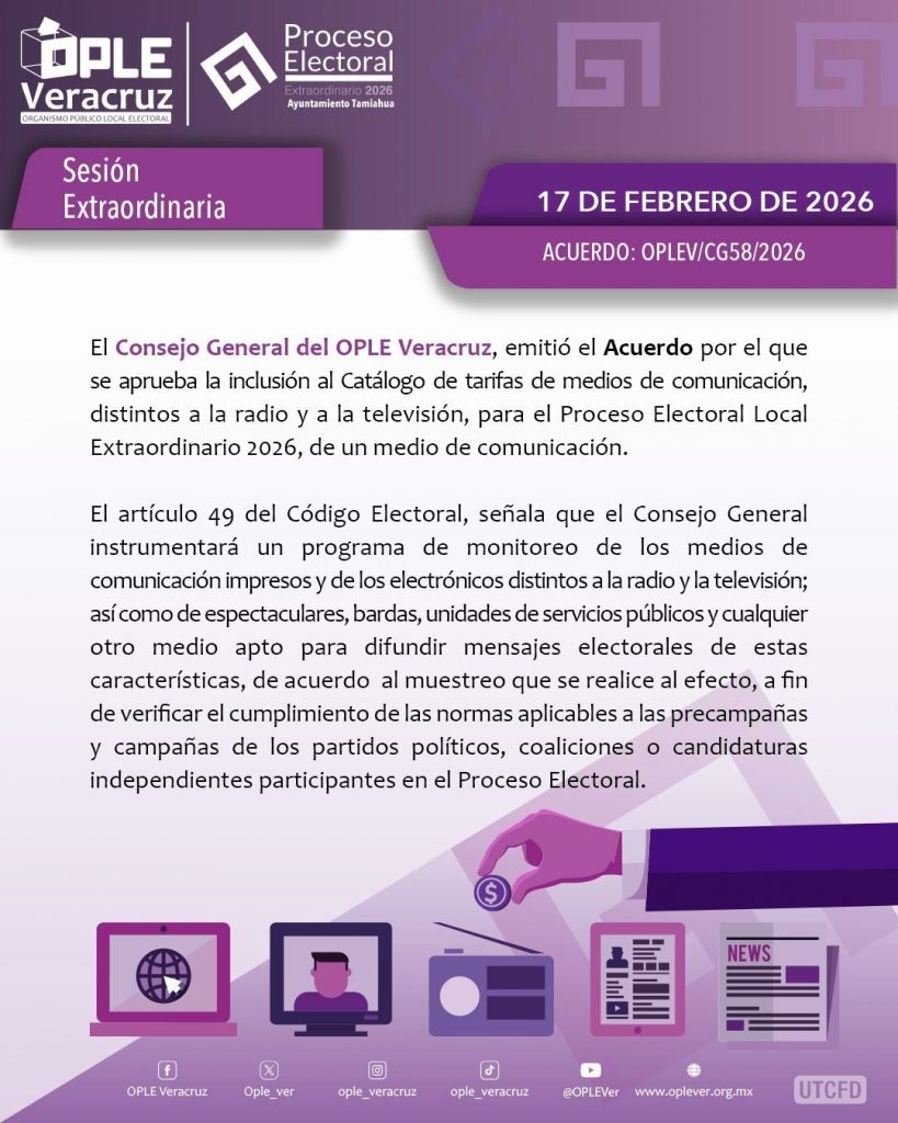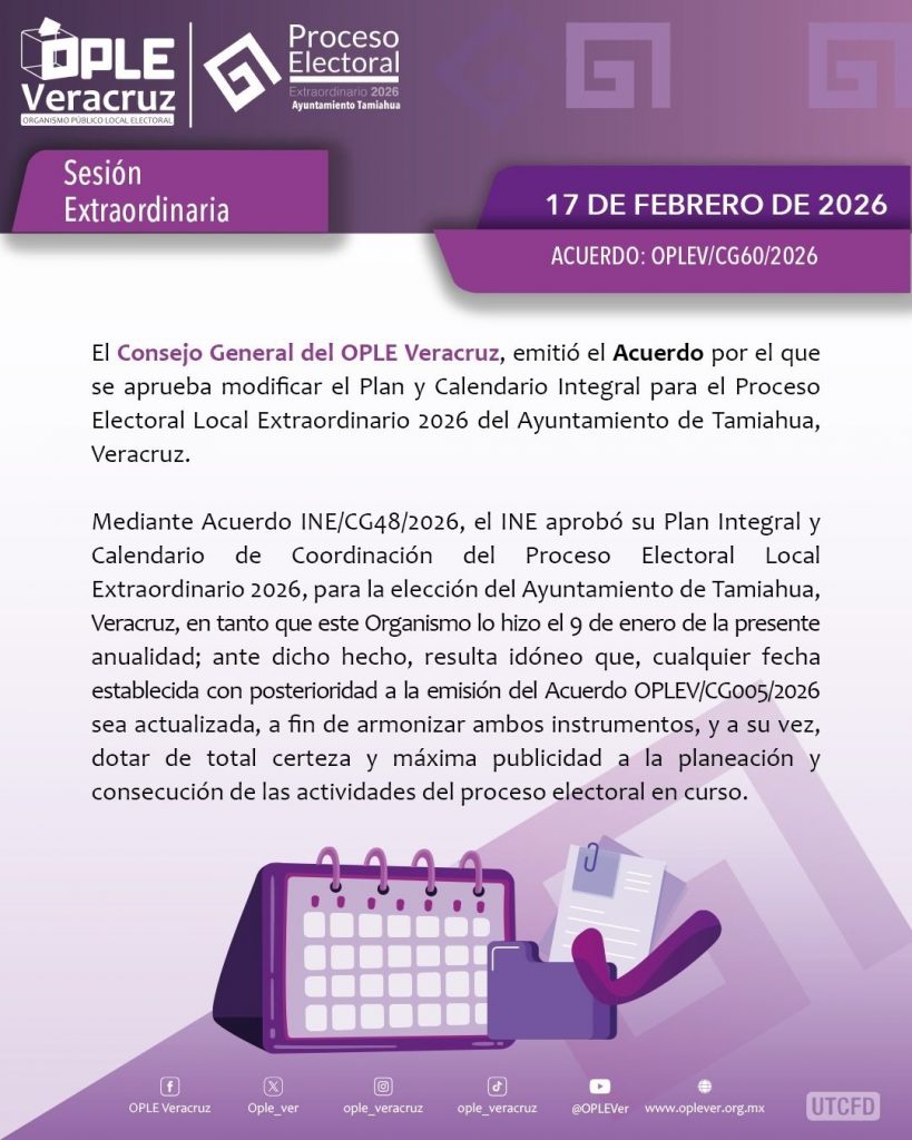 En sesión extraordinaria, el Consejo General del Organismo Público Local Electoral del Estado de Veracruz (OPLE Veracruz) aprobó modificar el Plan y Calendario Integral para el Proceso Electoral Local Extraordinario 2026 (PELE 2026) para la elección del Ayuntamiento del Municipio de Tamiahua.