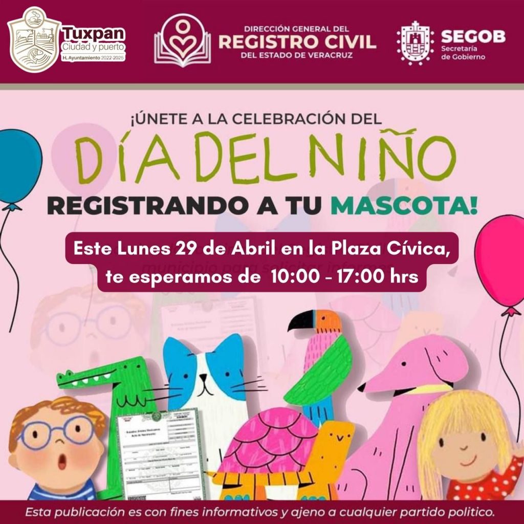 Tuxpan, Ver. – En el marco del Día del Niño, la Dirección General del Registro Civil y el Gobierno de Tuxpan llevarán a cabo el registro gratuito de mascotas, este lunes 29 de abril, en la Plaza Cívica, de 10:00 a 17:00 horas.