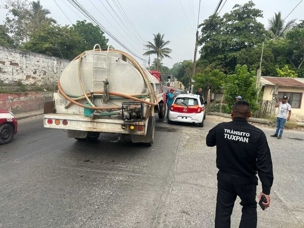 Alrededor de las 08:45 hrs sobre el libramiento Adolfo López Mateos esquina con calle división del norte en la colonia el esfuerzo se vió involucrado el ciudadano Rogelio «N» de 65 años de edad con domicilio en calle Hidalgo de la congregación Santiago de la Peña el cual manejaba un vehículo pesado de la marca dina tipo chasis una pipa de color blanco con rojo modelo 1974 placas XX5032A del Estado el cual en un descuido vial colisiona a un vehículo Nissan tipo March de color blanco con rojo modelo 2020 sin placas con el número económico 1738 el cual era manejado por el ciudadano Elber «N» de 48 años de edad y con domicilio en la laja de zapote bueno en Tuxpan Veracruz. Por fortuna no hubo lesionado, solamente daños materiales.