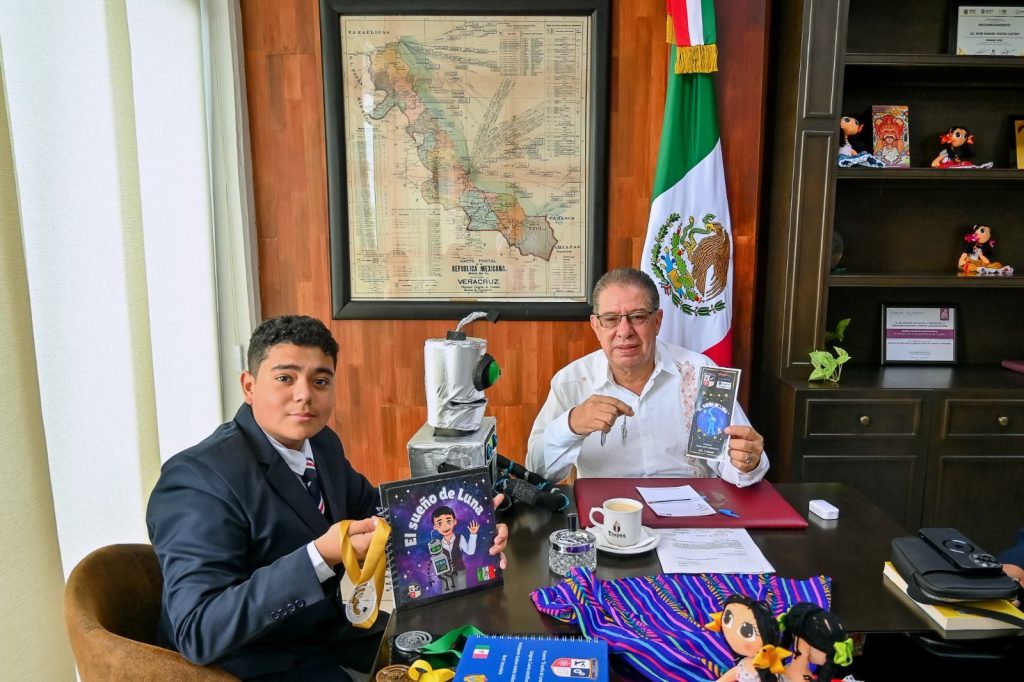 El estudiante de secundaria del Colegio Internacional de Tuxpan sostuvo un dialogo muy ameno con el presidente municipal y le dio detalles de lo que fue su participación en la categoría de cuento científico, en la que compitió contra representantes de países de Latinoamérica y España.