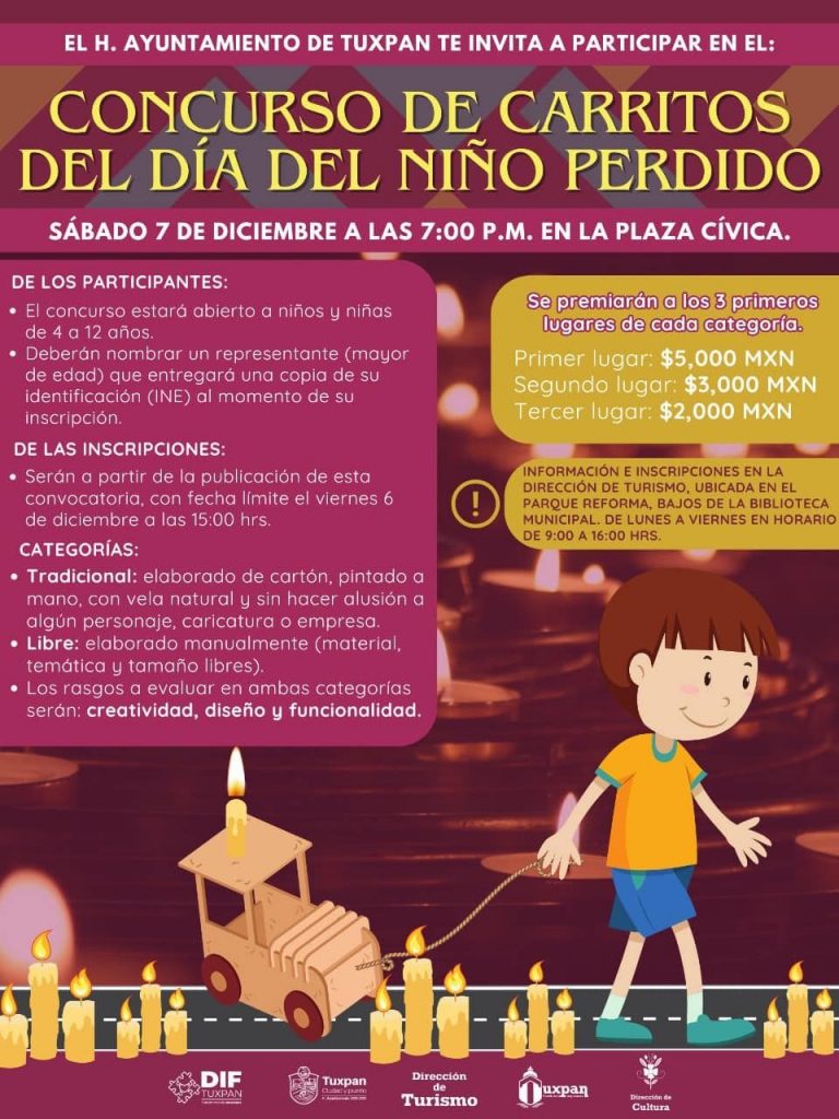 Tuxpan, Ver., 28 de noviembre de 2024.- El H. Ayuntamiento de Tuxpan invita a niñas y niños de 4 a 12 años de edad, a participar en el “Concurso de Carritos del Día del Niño Perdido”, que se llevará a cabo en la plaza cívica el próximo sábado 7 de diciembre, a las 7:00 p.m.