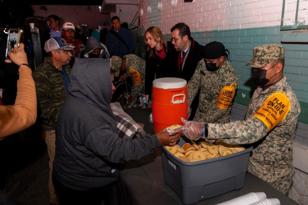 Posteriormente, personal del DIF y SEDENA entregaron cobijas, alimentos y bebidas calientes a familias que esperan en las afueras de la clínica del Instituto Mexicano del Seguro Social (IMSS).