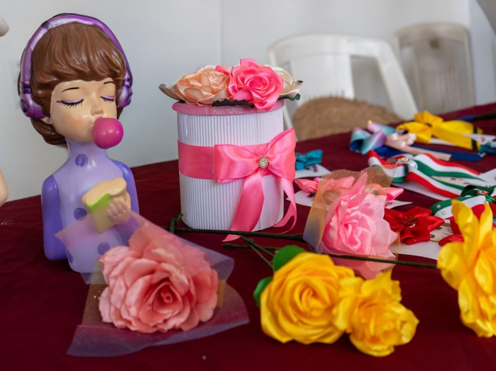 Del mismo modo, se expusieron manualidades de listón creadas en el curso de Flores Eternas, de la fundación Sin Miedo a Trabajar Contigo.