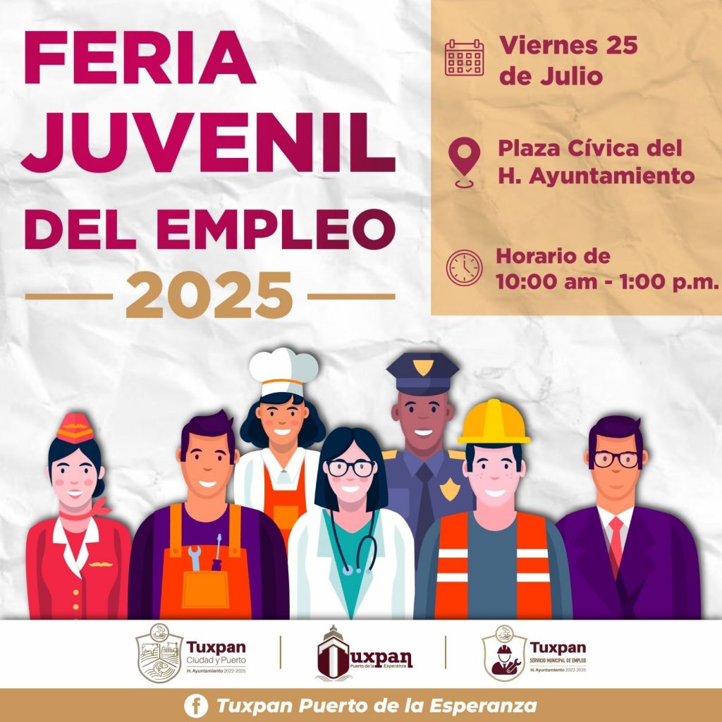 Mañana viernes la Secretaría de Gobernación y el H. Ayuntamiento de Tuxpan, a través del Servicio Municipal de Empleo llevarán a cabo la Feria Juvenil del Empleo 2025.