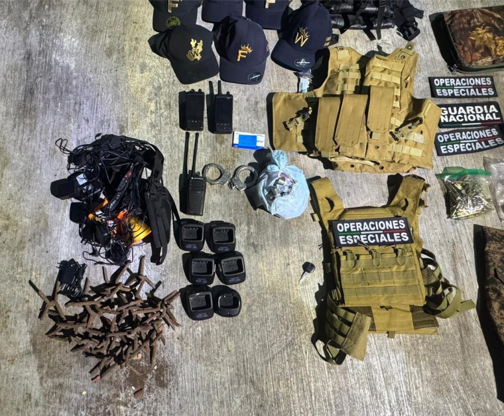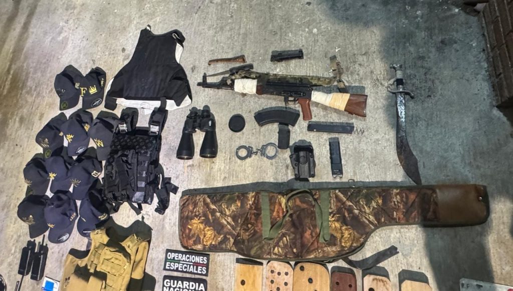 Derivado de lo anterior, personal naval localizó en flagrancia un domicilio, en el que se aseguró un fusil abastecido con 30 cartuchos 7.62×39 mm; 76 cartuchos calibre 2.23 mm; 46 cartuchos calibre 12 mm; dos equipos de radio comunicación; 19 cartuchos calibre 40 mm; un cuchillo; cuatro chalecos tácticos; 11 gorras tácticas; seis tablas de madera de distintos tamaños y grosor con orificios; seis placas vehiculares y dos de motocicletas.