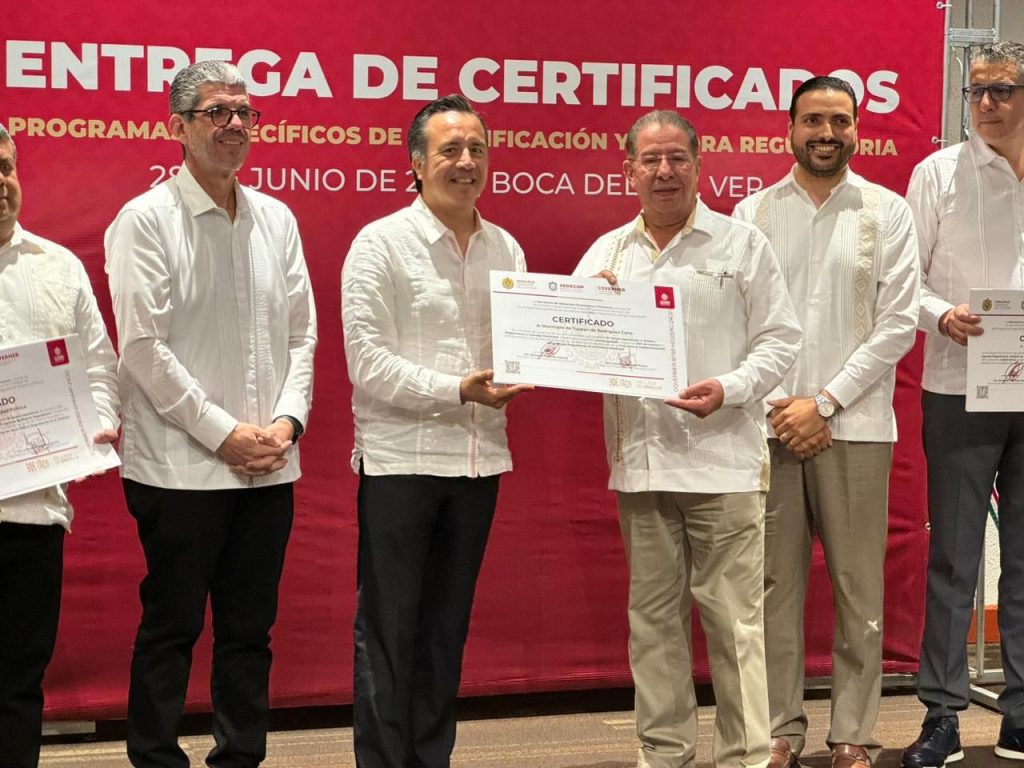 • El gobernador Cuitláhuac García Jiménez entregó el certificado al alcalde José Manuel Pozos Castro.