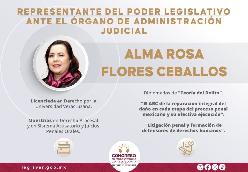 En sesión extraordinaria y con 40 votos a favor, el Pleno de la LXVII Legislatura designó a la ciudadana Alma Rosa Flores Ceballos como representante del Poder Legislativo ante el Órgano de Administración Judicial, en vista de que cumple con los requisitos establecidos en el artículo 62 de la Constitución Política local y por la experiencia adquirida a lo largo de su carrera en el Poder Judicial estatal.