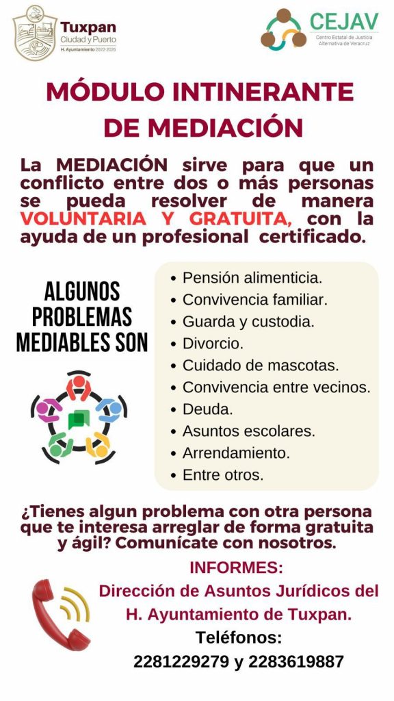 Para mayor información sobre la solución de conflictos sin costo, pueden comunicarse a los teléfonos 228-122-9279 y 228-361-9887, o acudir a la Dirección de Asuntos Jurídicos del H. Ayuntamiento de Tuxpan, en la planta alta de presidencia municipal.