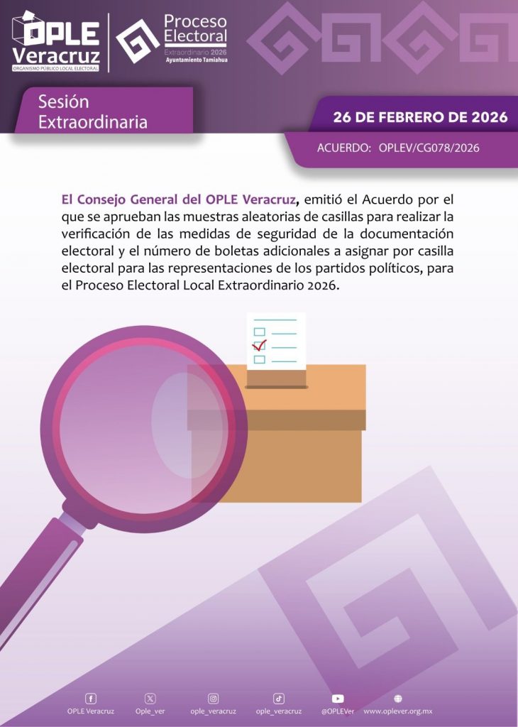 Y se aprobaron las muestras aleatorias de casillas para realizar la verificación de las medidas de seguridad de la documentación electoral y el número de boletas adicionales a asignar por casilla electoral para las representaciones de los partidos políticos, para el PELE 2026.