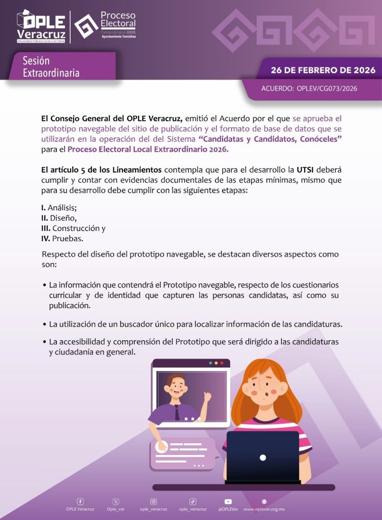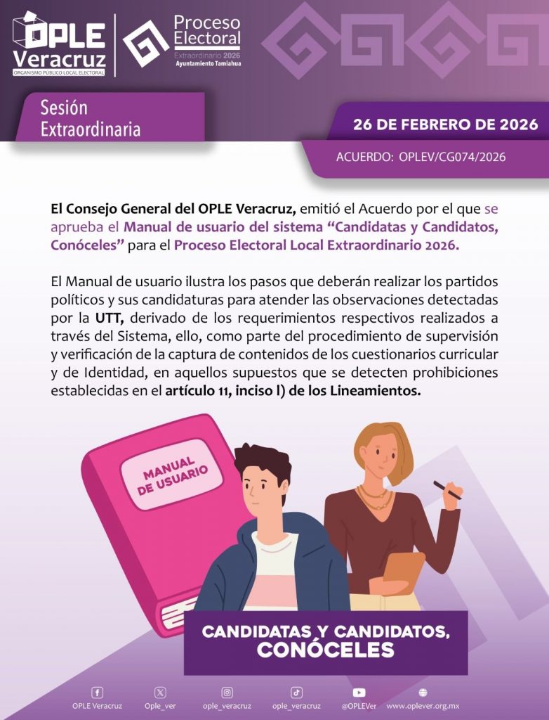 En el marco del Proceso Electoral Local Extraordinario 2026 (PELE 2026) para la elección del Ayuntamiento del Municipio de Tamiahua, se aprobó el prototipo navegable del sitio de publicación y el formato de base de datos que se utilizarán en la operación del Sistema “Candidatas y Candidatos, Conóceles”, así como el Manual de usuario de este mismo.