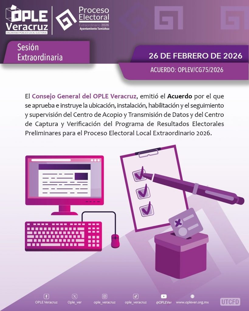 Se aprobó e instruyó la ubicación, instalación, habilitación y el seguimiento y supervisión del Centro de Acopio y Transmisión de Datos (CATD) y del Centro de Captura y Verificación (CCV) del Programa de Resultados Electorales Preliminares para el Proceso Electoral Local Extraordinario 2026.