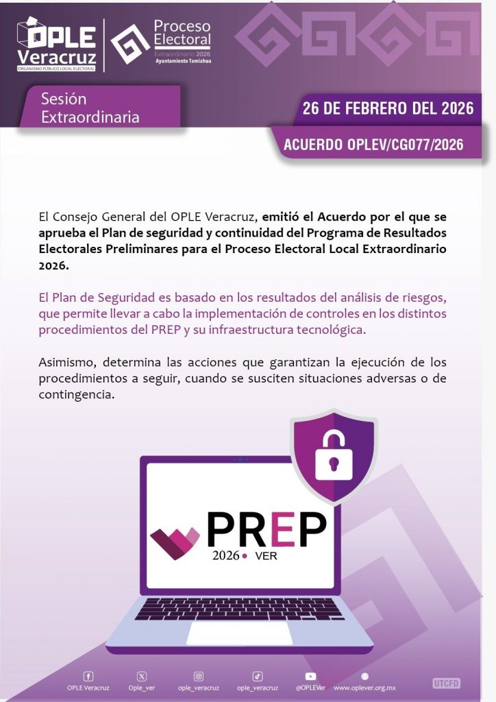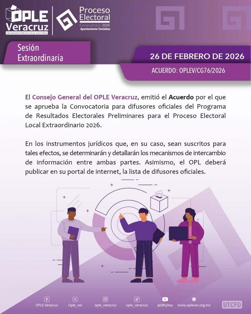 Asimismo, se aprobó la Convocatoria para Difusores Oficiales del Programa de Resultados Electorales Preliminares para los comicios de Tamiahua, que podrían ser instituciones académicas, públicas o privadas, y medios de comunicación en general.