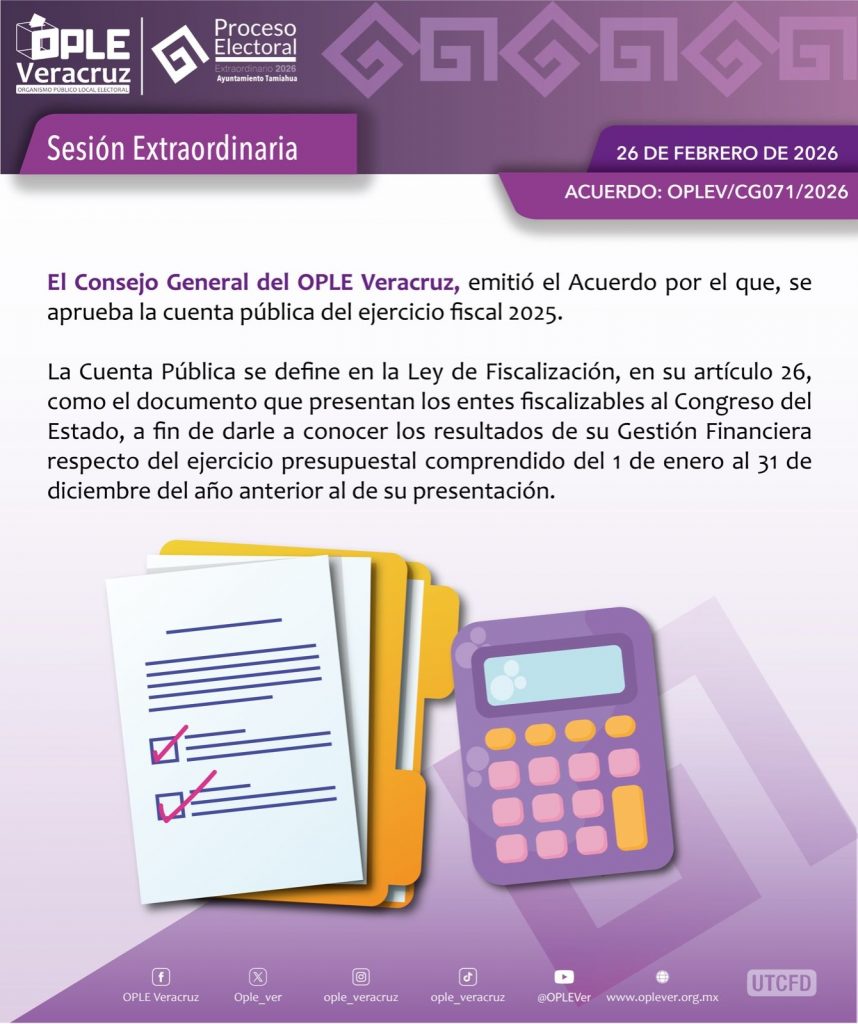 Xalapa, Ver., 26 de febrero 2026.- En sesión extraordinaria, el Consejo General del Organismo Público Local Electoral del Estado de Veracruz (OPLE Veracruz) aprobó la cuenta pública del ejercicio fiscal 2025.