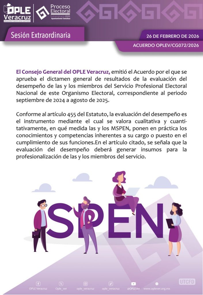 En tanto que en sesión ordinaria se presentaron los siguientes informes presentados por la Secretaría Ejecutiva: Informe respecto de las resoluciones que competen al Consejo General del Organismo Público Local Electoral del Estado de Veracruz, dictadas por los órganos jurisdiccionales. Informe mensual en relación a las peticiones y diligencias practicadas en ejercicio de la función de Oficialía Electoral. Informe respecto de las quejas y/o denuncias, así como medidas cautelares. Informe respecto del Registro Local y Nacional de personas condenadas y sancionadas en materia de violencia política contra las mujeres en razón de género, derivado de las resoluciones dictadas por órganos jurisdiccionales y el OPLE Veracruz. Segundo Informe de Seguimiento al Plan y Calendario Integral del Proceso Electoral Local Extraordinario 2026, febrero 2026. El informe semanal del monitoreo a los medios informativos del Proceso Electoral Local Extraordinario 2026, del periodo del 16 al 22 de febrero de 2026.
