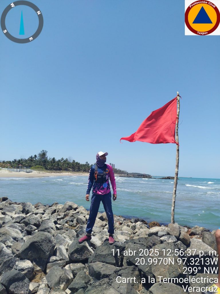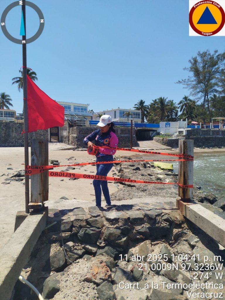 Tuxpan, Ver., 11 de abril de 2025.- Personal de Protección Civil y de la SSP Municipal colocaron una gran cantidad de avisos preventivos, en diversos puntos de la playa considerados como de riesgo para los turistas.