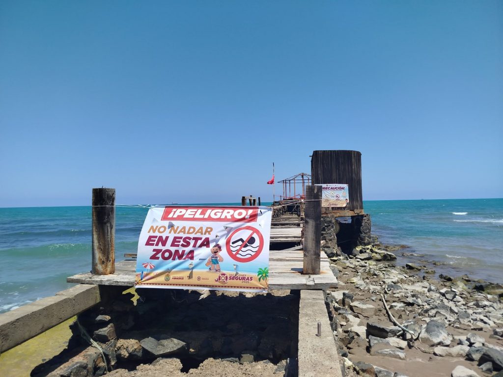 En las inmediaciones de escolleras se pueden ver los letreros con el aviso de “Prohibido nadar en esta área”, por lo que se pide a los bañistas que sean conscientes y eviten introducirse al agua en estos lugares con corrientes peligrosas.